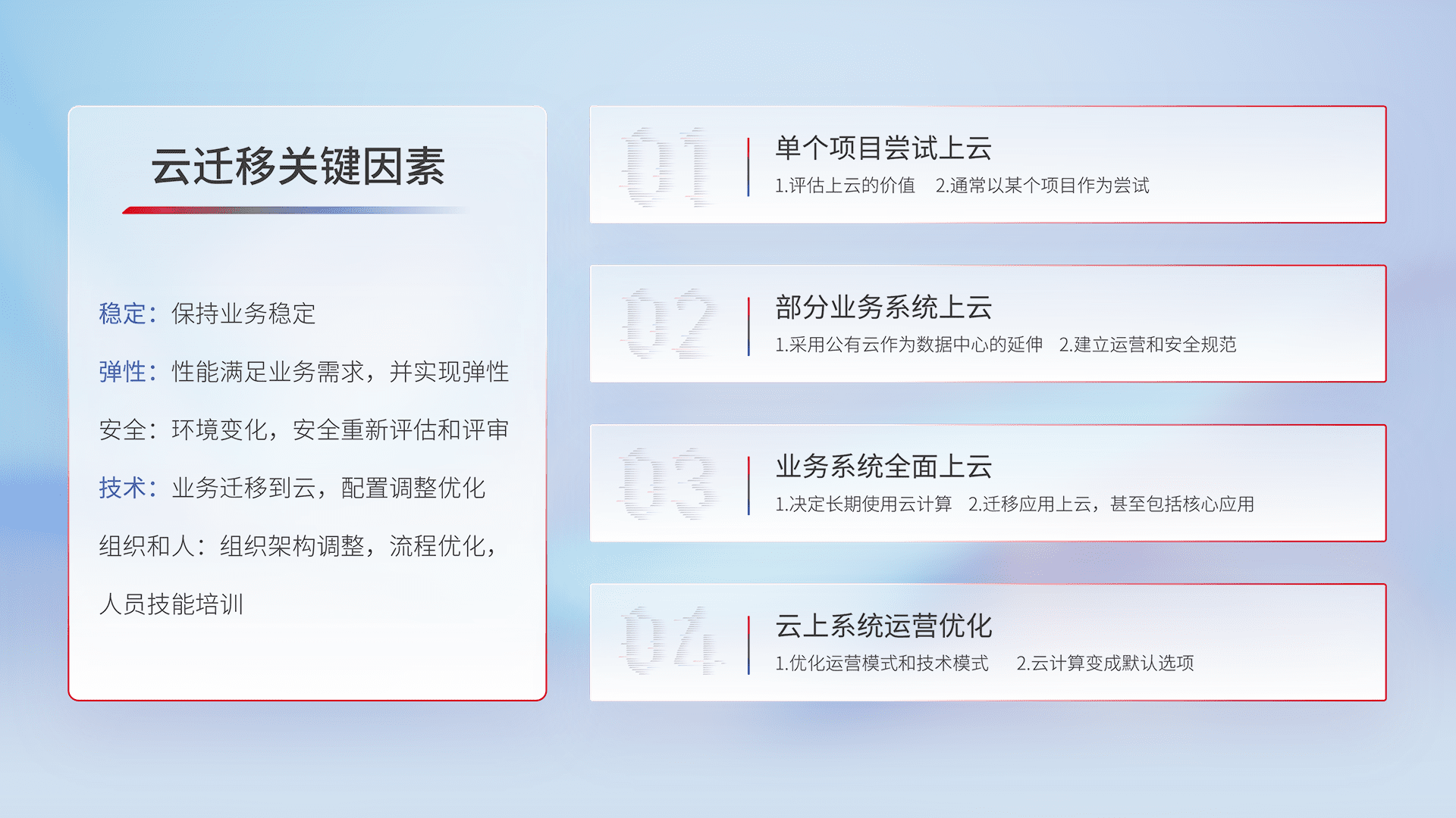 结合实际业务,,,从规划设计、、、、云平台选型、、、云原生改造、、数据迁移、、、集成交付,,,迁移全过程为客户识别最佳上云路径,,,,做好风险识别管理,,设计网络架构、、身份权限、、安全审计合规、、、、操作审计、、、、日志审计、、、监控告警策略、、、多站点容灾设计等,,对云上基础设施进行整体规划,,,提升IT治理水平,,以满足弹性、、、、高可用、、、高性能的需求。。。